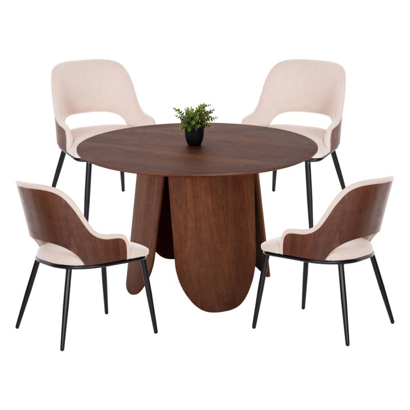 This indoor dining set consists of a DENTY table and 4 DELF chairs. DENTY is a round table for the dining room, with a beveled MDF tabletop with oak veneer in WALNUT color. This tabletop rests on a beautiful wooden cylindrical base with the same color. The DELF chairs are upholstered in BEIGE fabric and they have BLACK metal legs. What stands out, however, is that the entire back is wooden in WALNUT color and is curved and comfortable.