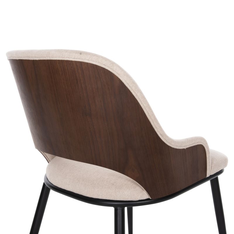 Chairs: The legs are metal, the back is wooden, while the seat and backrest are upholstered with BEIGE fabric.