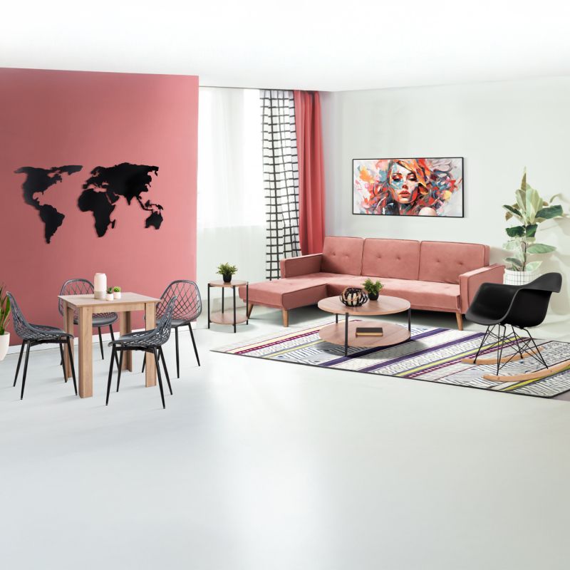 This set includes a corner sofabed, coffee table, side table, rocking chair, kitchen table and 2 chairs!