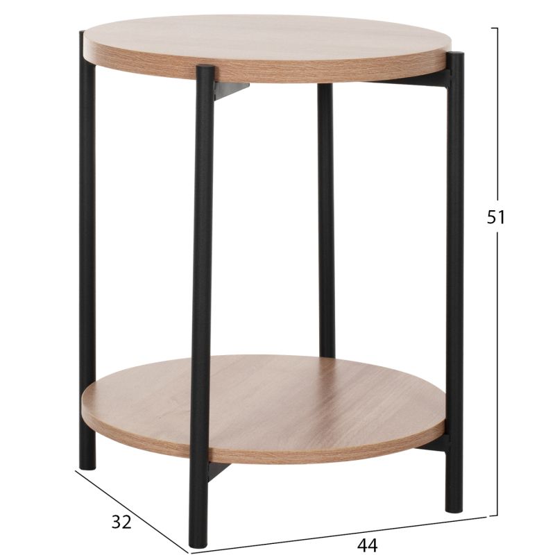 Round side table with 2 levels. Melamine-metal in OAK and black. Dimensions: Φ40x52H cm.