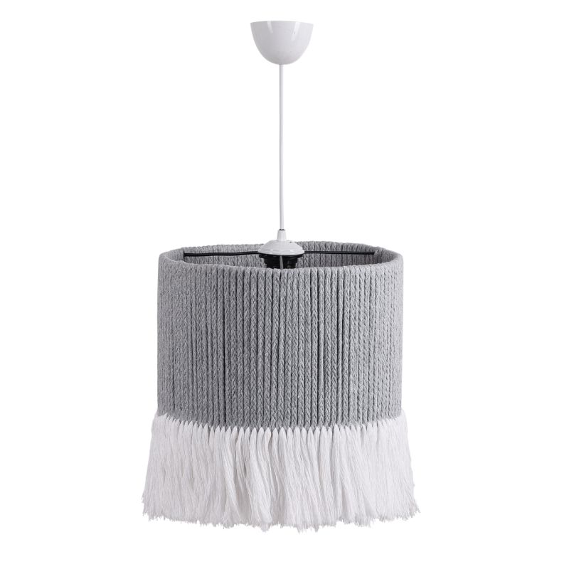 Hm7652.05- Ceiling pendant----If you want to decorate your space with a lamp in boho style, this is the right choice. It is a single-light lamp with a cylindrical "cap" made of GREY thin knitted rope, of high quality and durable. The special feature of this lamp, however, is that the "cap" ends in WHITE colored fringes, giving a different feel to the space.
