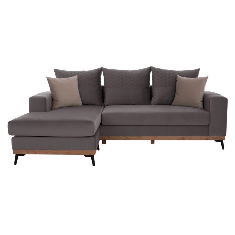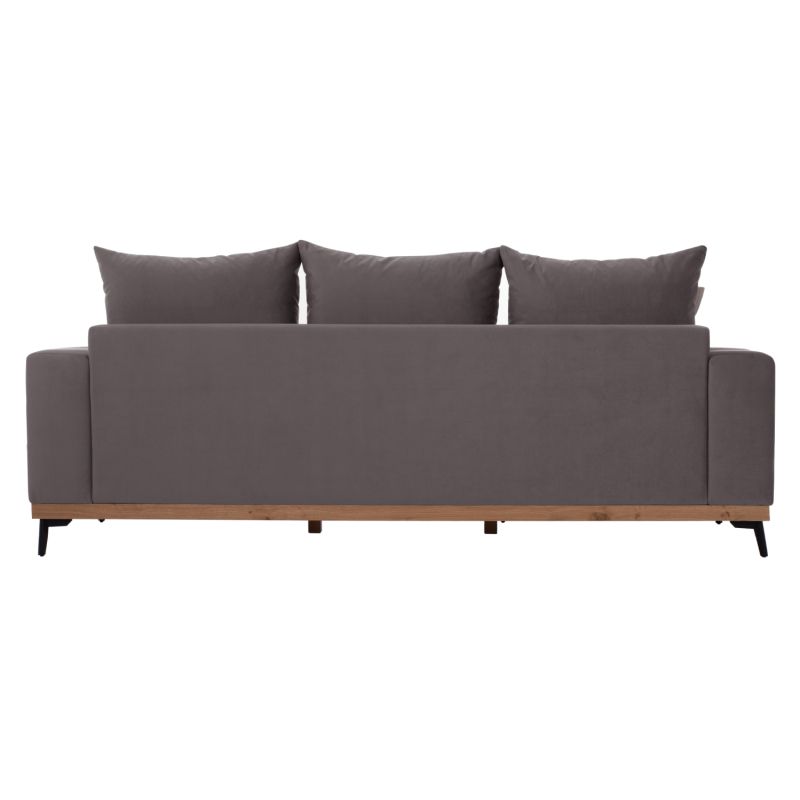 Starting with the basics and the obvious, the color of the velvety upholstery of the sofa is SAHARA 13- grey. It has 3 back cushions in the same color and two smaller decorative cushions in SAHARA16- light gray. The 2 large seat cushions combined with the back cushions give the perfect sense of comfort! The back cushions have a half-quilted style, and there is also a beautiful, quilted strip on the large arm. The cushions at their backside have a lighter gray color, while the two-tone coloring continues on the two small decorative cushions, as well.