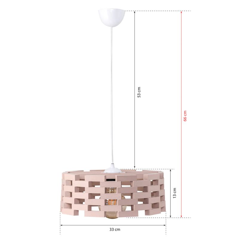 The aesthetic superiority of this luminaire will make it stand out in your space. In addition to various rooms of your house, it is also suitable for business premises such as restaurants, cafes, hotels, etc. The PINK color of the “cap” is blithe, capturing the eye and can instantly change your mood. The light diffuses on all directions through the wooden grid into your space and at the same time, it can be combined with many other materials and designs to fully highlight the aesthetic virtues of the lamp.