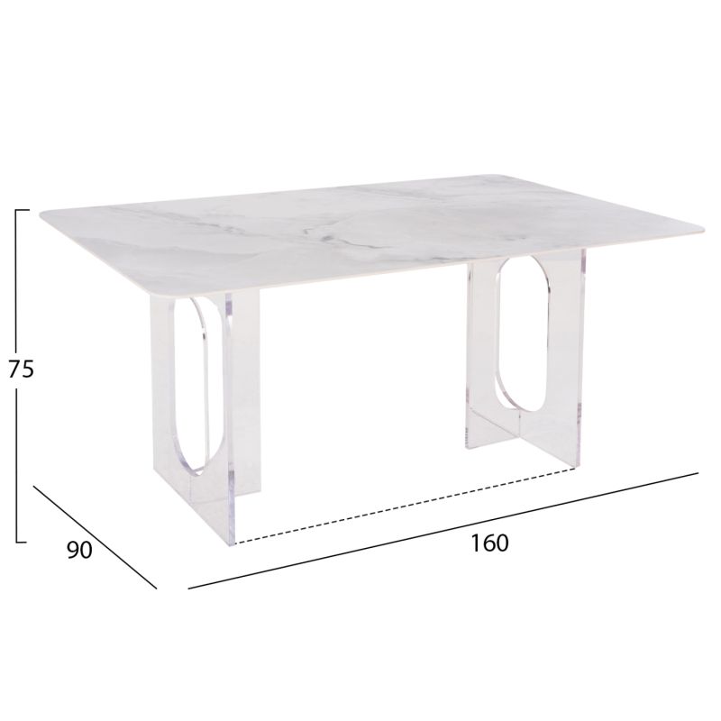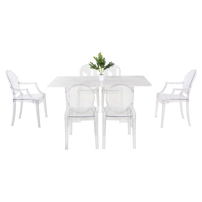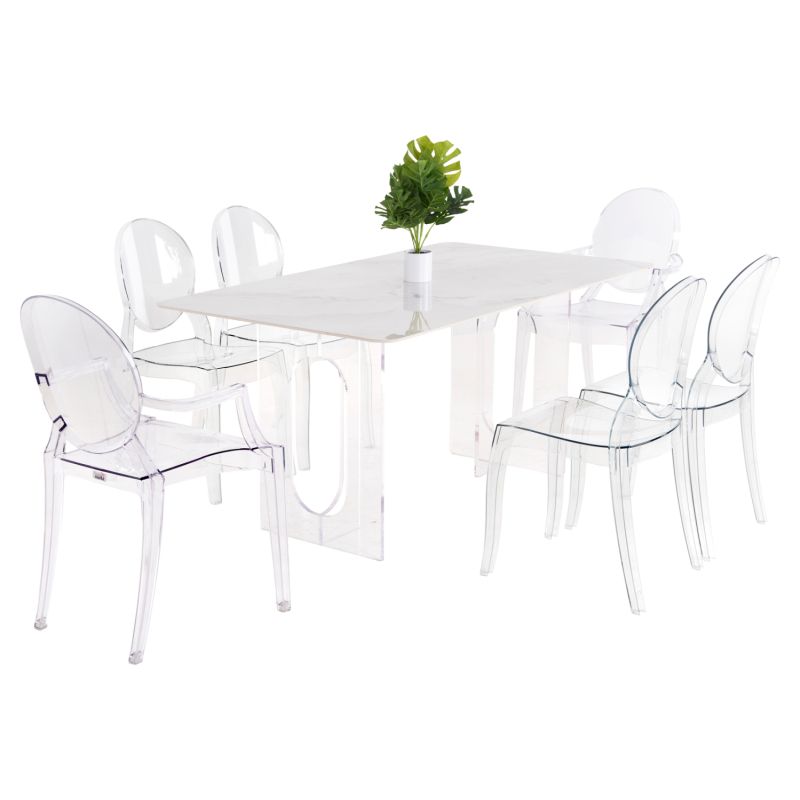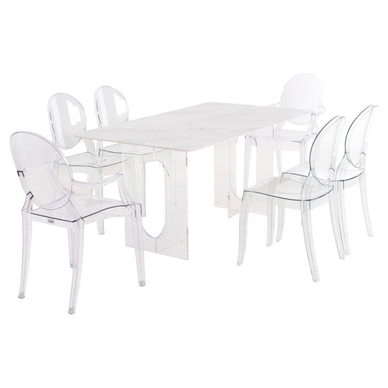 This indoor dining set is very special. It consists of a table, 2 armchairs, and 4 chairs. AETHER is a rectangular dining table with a jade ceramic tabletop in WHITE color. This tabletop is mounted on two transparent acrylic bases that give the table a feeling of luxury and purity. The 2 armchairs as well as the 4 ARAMIS chairs are completely transparent from cast acrylic material of high durability and create the perfect composition with the table.