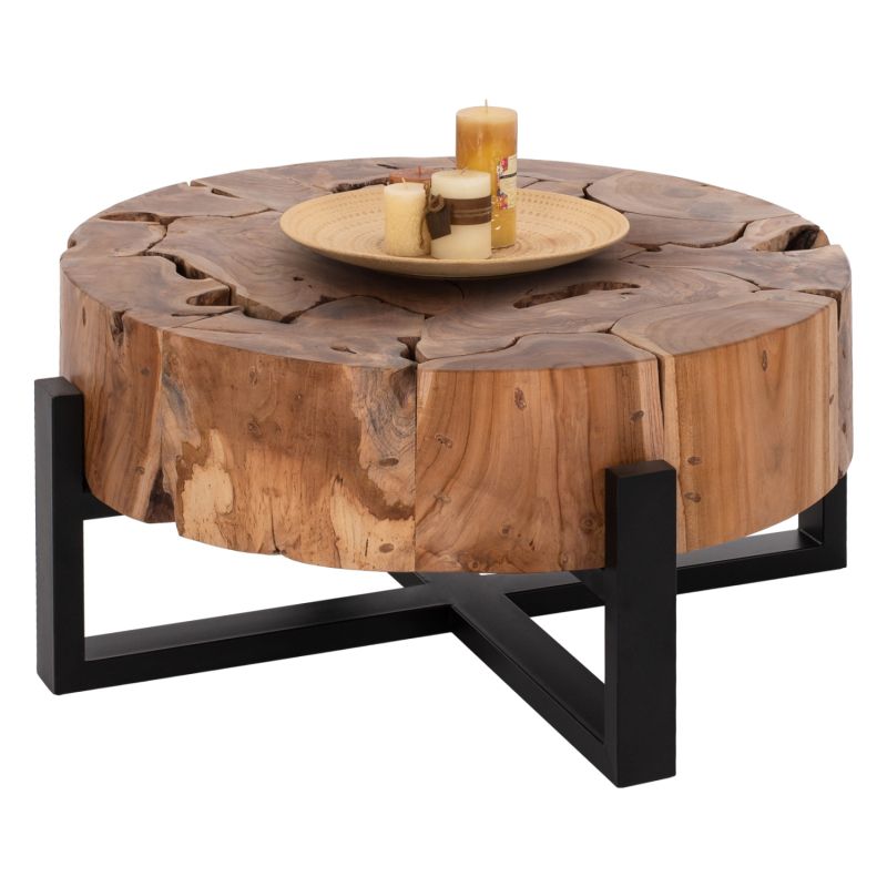 MOBLEY is a round short table for the living room, with satisfactory dimensions in a natural wood color. The table rests on a BLACK cross-shaped metal base. This table will aesthetically upgrade your living room while it can match many different styles and colors in the surrounding space. The existing cracks or those that may be created over time are due to the contraction-expansion of the living organism called solid wood, and are not a manufacturing defect, giving originality and unique design to your space. These are not a product defect.