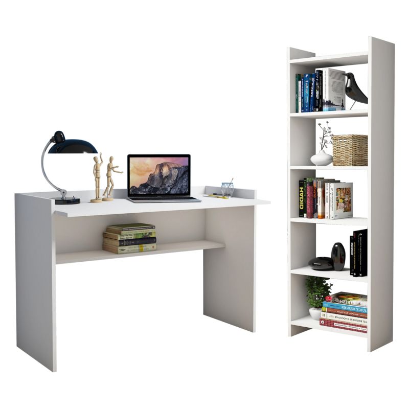 Office set with an elegant and simple design, consisting of a desk and a bookcase, made of durable 18 mm thick high-quality melamine, in a white shade.