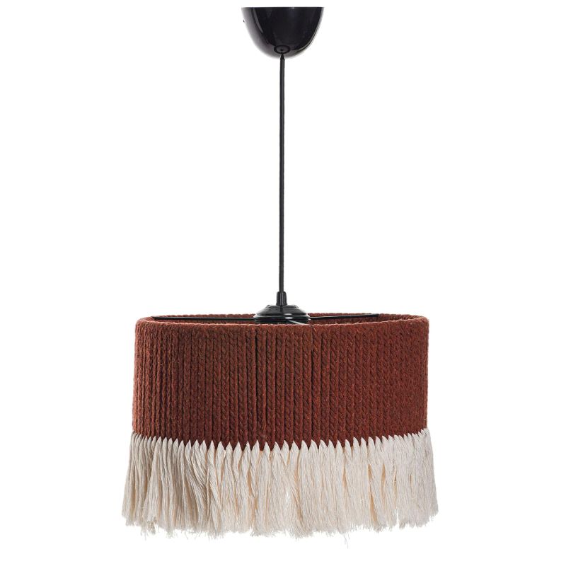 Hm7657.03- Ceiling pendant----If you want to decorate your space with a lamp in boho style, this is the right choice. It is a single-light lamp with a cylindrical "cap" made of BROWN thin knitted rope, of high quality and durability. The special feature of this lamp, however, is that the "cap" ends in WHITE colored fringes, giving a different feel to the space.