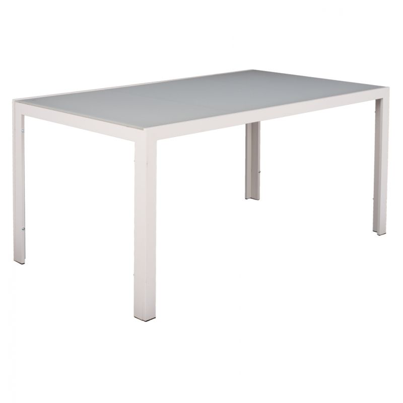 Outdoor table metal in ice white shade with glass on its surface.