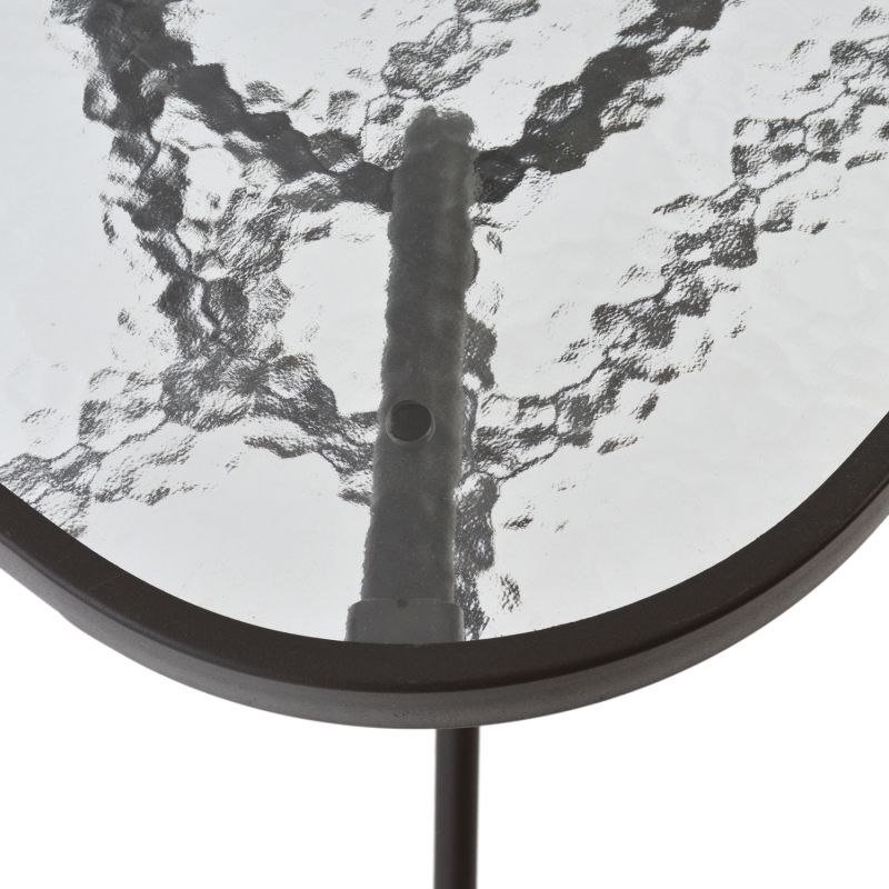 A metallic table for outdoor spaces in brown color with security glass.