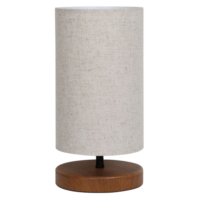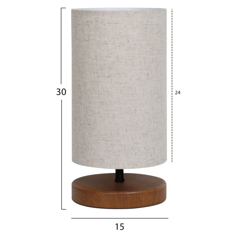 Decorative table lamp with wooden circular base in brown color and cylinder drum shade in ecru wicker fabric. The light of the lamp diffuses sweetly into the space and creates a warm atmosphere. These lamps are not ideal for reading and this should always be taken into account when considering buying one. They are purely decorative and their matching with the surrounding space should be harmonious. This lamp is simple, elegant and convenient in dimensions, providing countless possibilities to "tie" with the rest of your decoration. It is a small work of art.