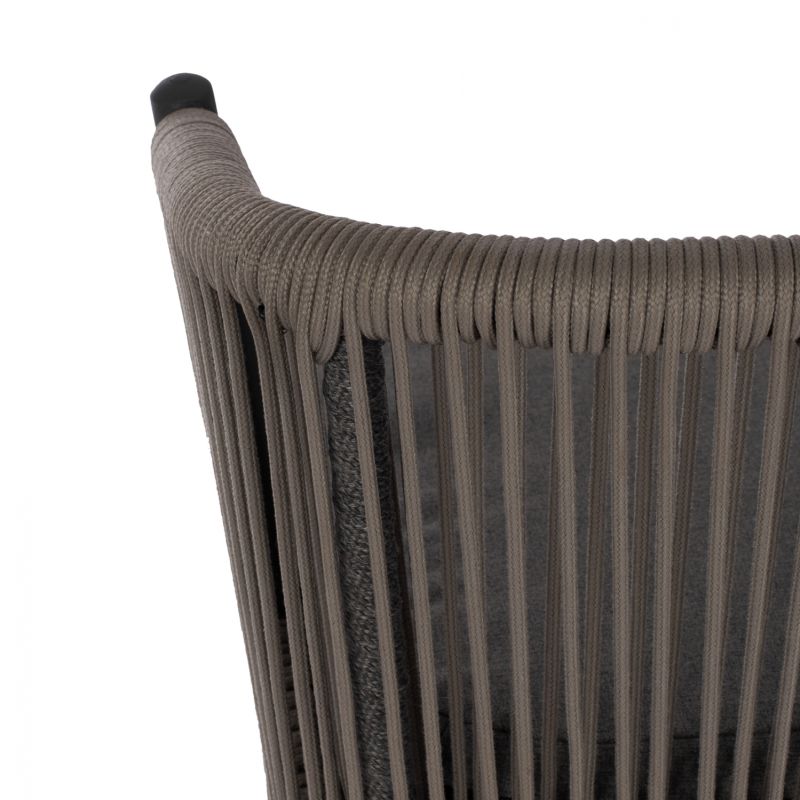 Μοντέρνο σκαμπό με πλάτη και μαξιλάρι, εξωτερικού αλλά και εσωτερικού χώρου, κατασκευασμένο από μεταλλικό σκελετό σε γκρι απόχρωση, επενδυμένο με πλεκτό σχοινί σε επίσης γκρι απόχρωση.