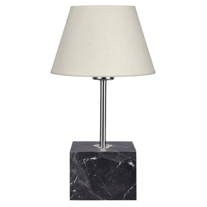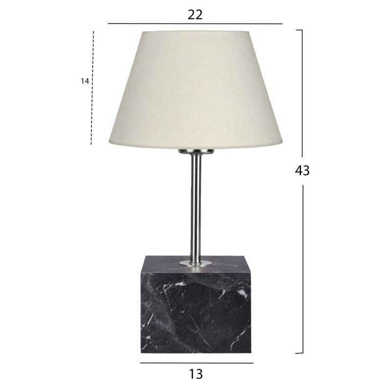 Decorative table lamp with single pillar. The base of the luminaire has the shape of a cube with the appearance of charcoal-grey marble while the pillar is in silver color. The "cap" has a trapezoidal circular shape in ecru color. The light diffuses in the space pleasantly and its reflection on the golden pillar of the luminaire and the cubic base, plays pleasantly with your eyes. These types of luminaires are not intended for reading and this should always be taken into account when choosing one. They are purely decorative and their matching with the surrounding area should be harmonious. This lamp is elegant and convenient in dimensions, providing countless possibilities to "tie" with the rest of your decoration. It is a small work of art.