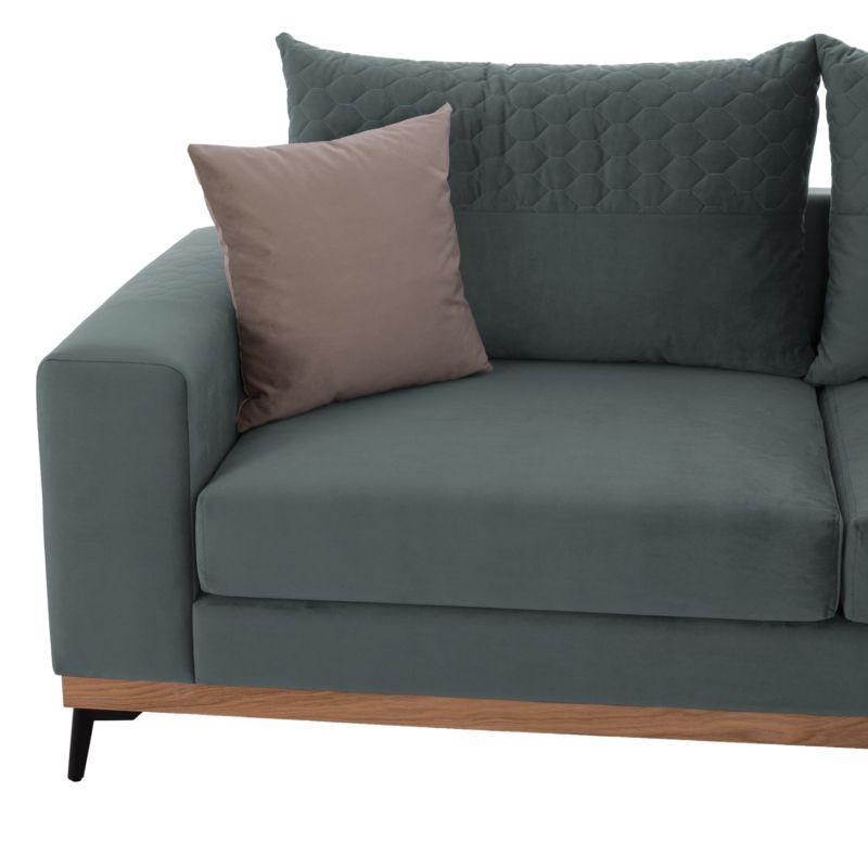 Starting with the basics and the obvious, the color of the velvety upholstery of this large sofa is SAHARA 17- mint. It has 5 backrest cushions in the same color and two smaller decorative cushions in SAHARA 03- ecru. The 4 seat cushions combined with the backrest cushions give the perfect sense of comfort! The backrest cushions have a half-quilted style, and there is also a beautiful, quilted strip on the large arm. The large seat cushion that forms the corner of the sofa sports a Velcro patch underneath it, and sticks to the special surface of the corner stool’s frame. The piece that creates the right corner connects to the rest of the sofa harmoniously with reinforced galvanized panel hangers (vertical drawers) for enormous durability and ease of use.