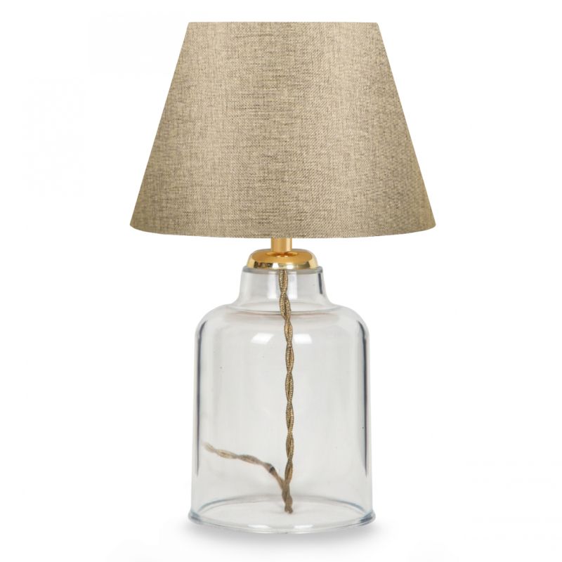 Light up the spaces you want with this flexible table lamp with a transparent plastic body. An idyllic combination of casual charm and polished design gives a timelessness that will not grow old. The transparent bottle-shaped base keeps this table lamp light and airy. The base and the "cap" in the shape of an open bell in golden color are combined to give this lamp the perfect texture and a farmhouse character. The golden pillar at the top of the base with the gold-colored cable, create a beautiful combination, uniting the whole look and adding to the simple elegance of the lamp.