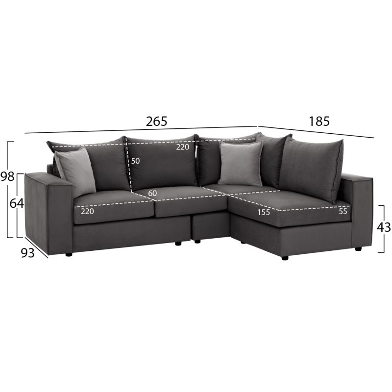 The main feature of the sofa, however, is that you can create the corner that suits you, either right or left. The piece that creates the corner, is independent and connected to the rest of the sofa harmoniously with a fabric with Velcro patch, while, of course, it can easily stand alone as a comfortable armchair without arms and create a set with a three-seater sofa and an armchair! The seat cushion of the armchair also has a Velcro patch underneath it, and sticks to the special fabric surface of the frame. The two pieces that make up the basic three-seater sofa are connected by reinforced galvanized panel hangers (vertically sliding) for enormous strength and ease of use.