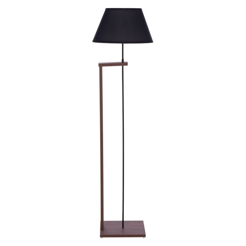 Floor lamp with a single metal pillar in black color. The feature of this lamp is that the pillar is accompanied and supported by a square base made of MDF wood in walnut color. The "cap" of the lamp has the shape of an open bell in black color.