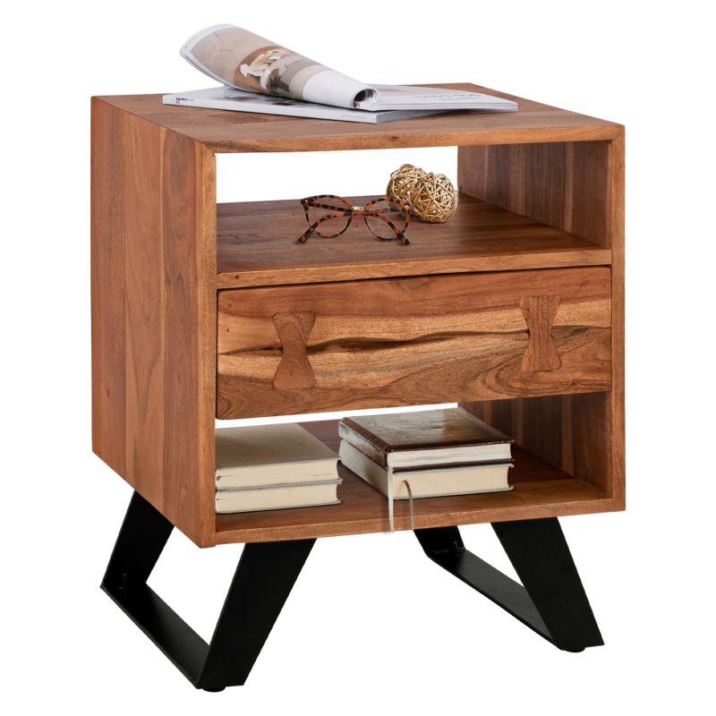 Nightstand from solid acacia wood in natural color with metallic legs in black color.