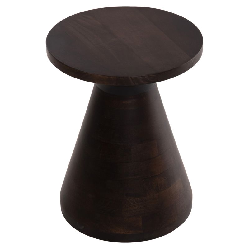 The “FOSS” round coffee table made entirely of solid mango wood in DARK BROWN looks like a stool, thanks to the conical shape of the base that ends in the round surface. A table that will impress with its shape and color.