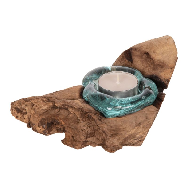 TABLE DECOR HM4283 CANDLE BASE-1 SPOT-SOLID TEAK WOOD AND GLASS-NATURAL