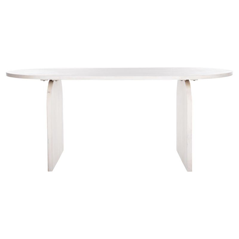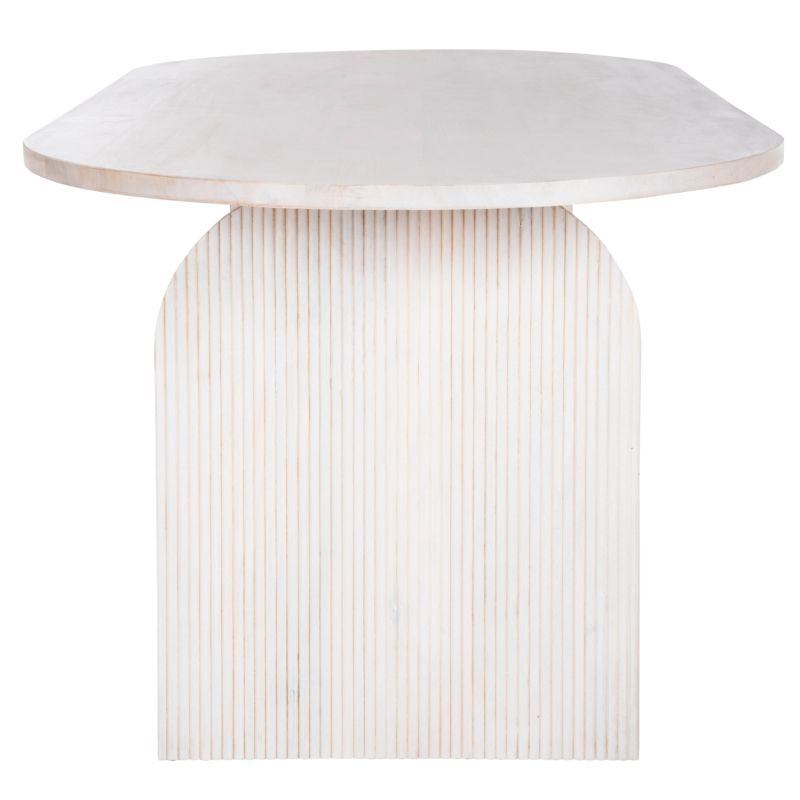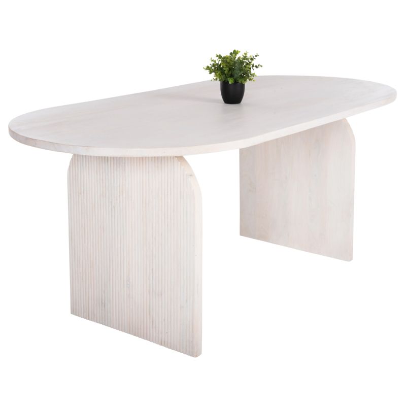 Discover the “HONKY” dining table made entirely of solid mango wood in WHITE color. The shape is a typical oval and rests on 2 massive arches made of the same wood and of the same color.