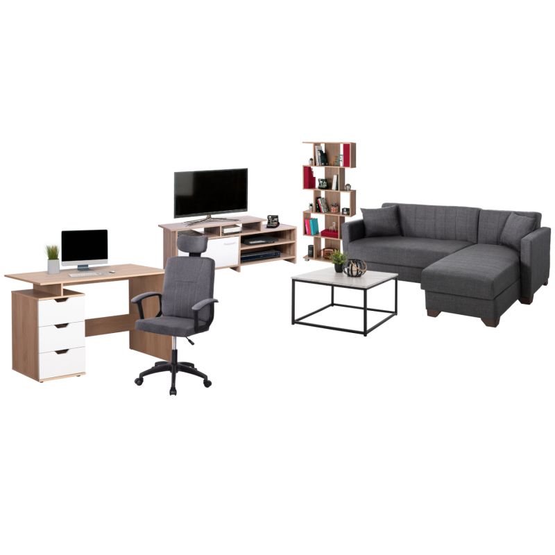 This set includes a bookcase, coffee table, desk, office chair, TV stand, and corner sofa-bed with storage space!