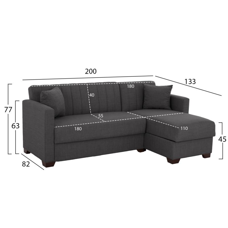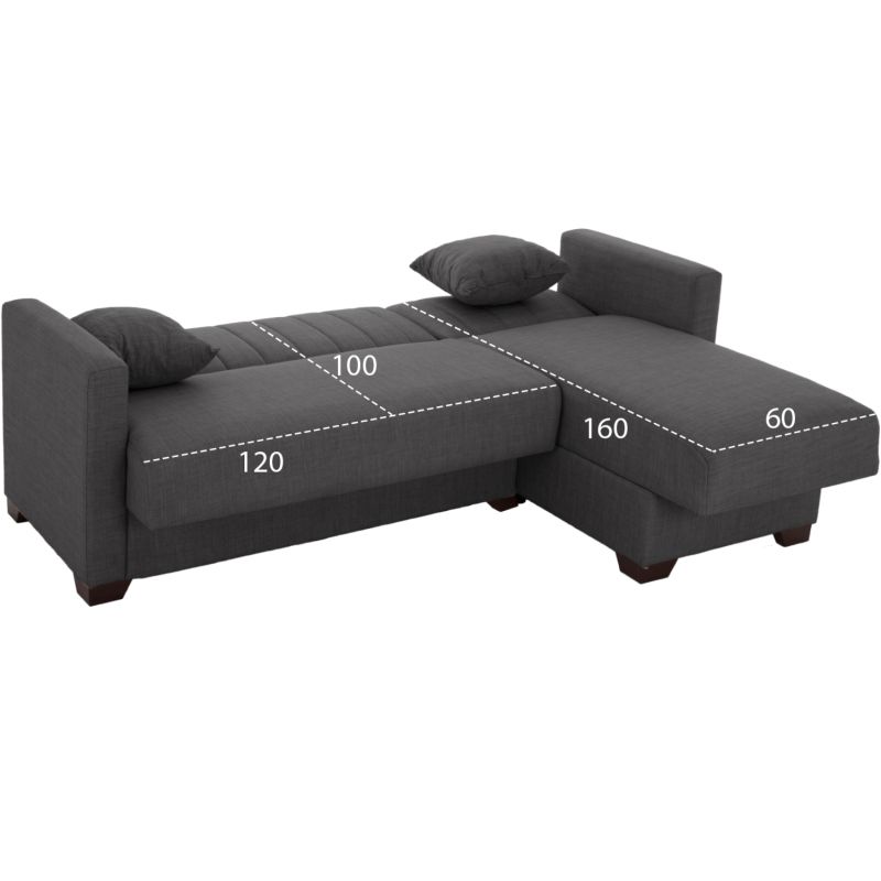 Reversible corner sofa-bed with storage space, upholstered in ANTHRACITE fabric. Dimensions: 225x94x70H cm.