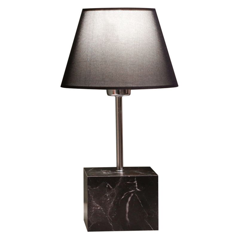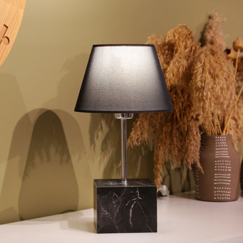 Декоративна настолна лампа с единична колона. Основата на осветителното тяло е с формата на куб с вид на въгленосив мрамор, а колоната е в златист цвят. "Шапката" е с трапецовидна кръгла форма в черен цвят. Светлината се разпръсква приятно в пространството и нейното отражение върху златната колона на осветителното тяло и кубичната основа, играе приятно с очите ви. Този тип осветителни тела не са предназначени за четене и това винаги трябва да се има предвид при избора им. Те са чисто декоративни и съчетаването им с околната среда трябва да е хармонично. Тази лампа е елегантна и удобна като размери, предоставяща безброй възможности за "завързване" с останалата част от вашата декорация. Това е едно малко произведение на изкуството.