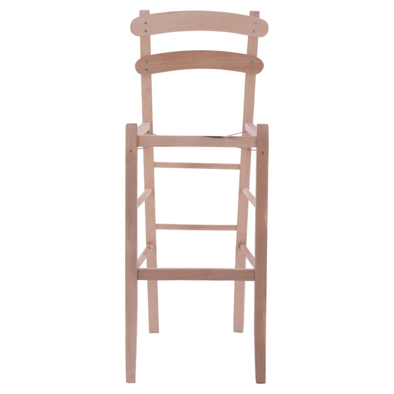 Тази дървена табуретка има традиционен дизайн с 4 високи крака, свързани заедно с пръти, които служат и като подложки за крака, квадратна седалка и удобна облегалка без ръце. Доставя се небоядисан и може да се използва в различни професионални пространства, стига да има съответната декоративна "визия".