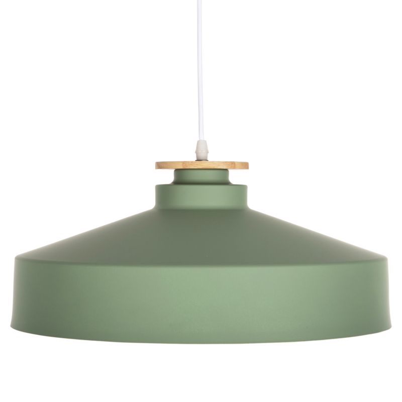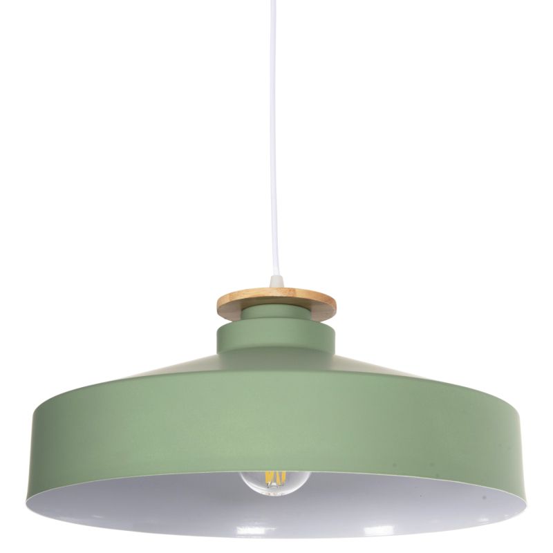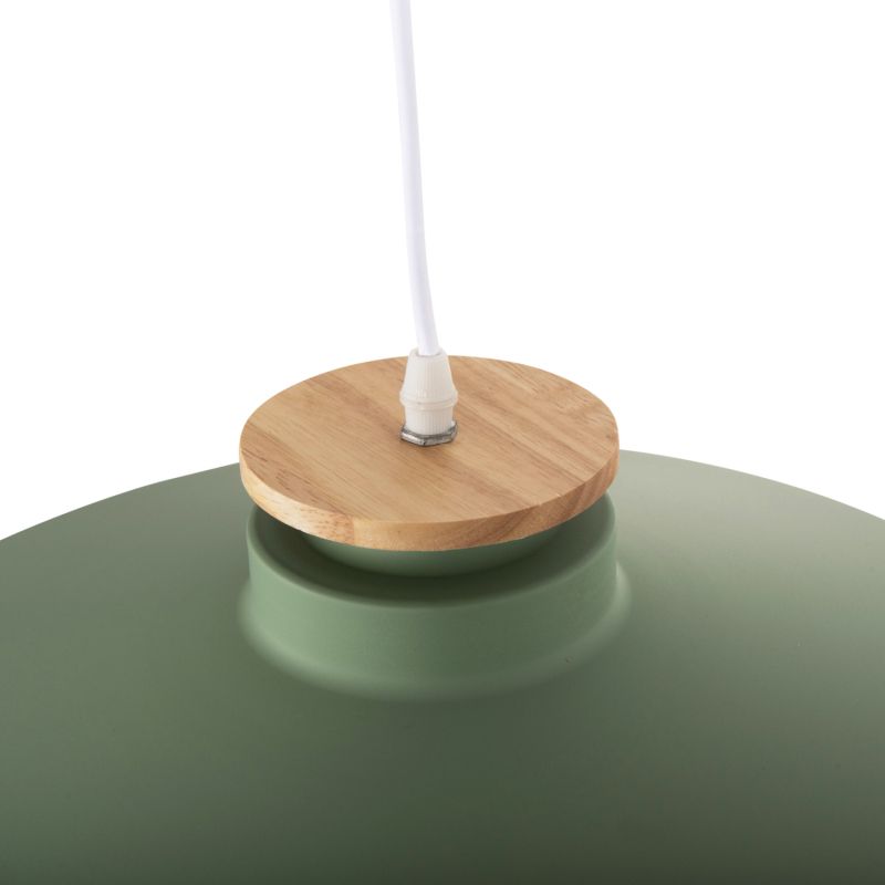Открийте нашата нова висяща таванна лампа и завършете декорацията си. Това е лампа със ЗЕЛЕНА плитка метална капачка във формата на камбана с дървени детайли в горната част на лампата. Естетически, той е завършен с черен висящ кабел и бяла таванна основа и е най-новата тенденция при плафониери.