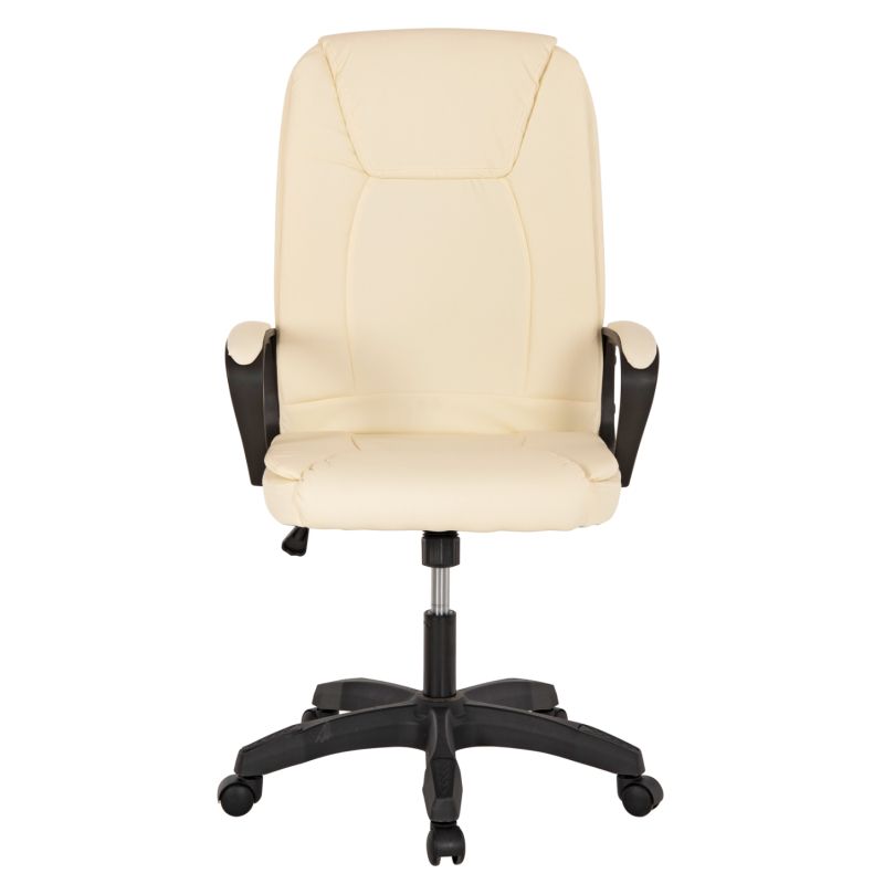 HM1188.03--Офис стол в ECRU цвят с удобни подлакътници в ЧЕРЕН цвят с ECRU възглавници с ергономичен наклон. Облегалката е висока и има богат слой от дунапренови материали, поддържащи целия ви торс, докато е тапициран с висококачествена PU кожа, както и удобната седалка с допълнителна повърхност от пяна. Основата е черна във формата на "звезда" и е изработена от полипропилен.