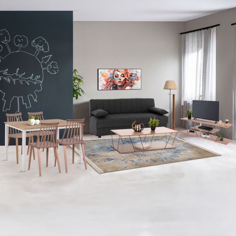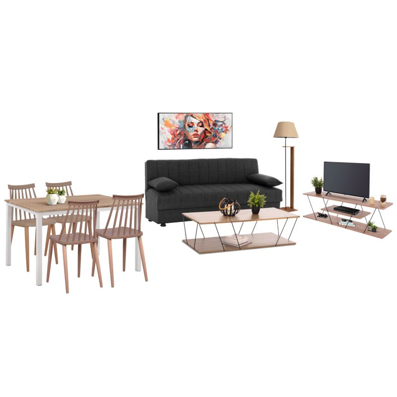 Този комплект включва разтегателен диван, масичка за кафе, мебел за телевизор, стояща лампа, кухненска маса, 4 стола и декорация за стена!