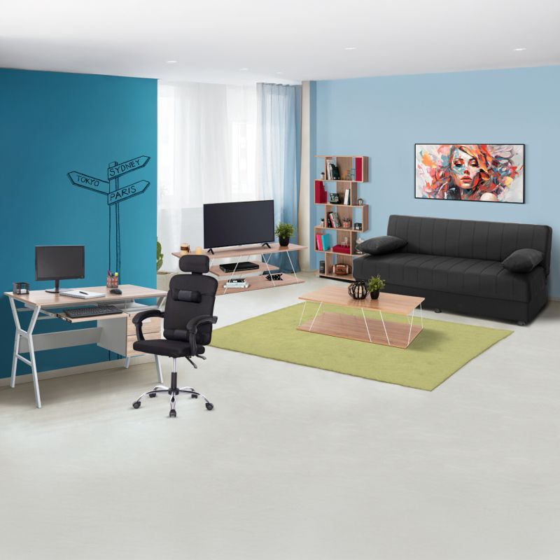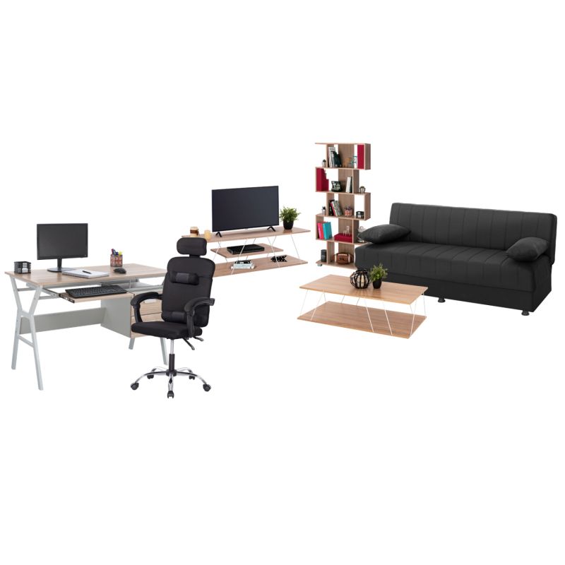 Този комплект включва разтегателен диван, библиотека, масичка за кафе, бюро, офис стол и поставка за телевизор!