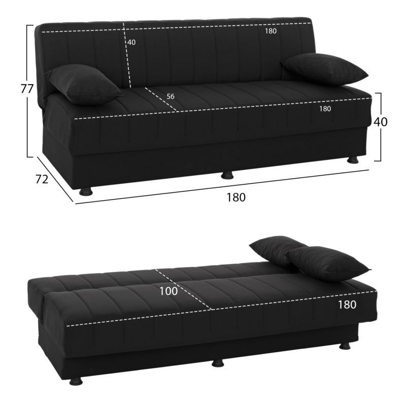 Диван тройка с черна дамаска, ставащ на легло с механизъм изглаждащ облегалката. Размери: 180x72x77H см.