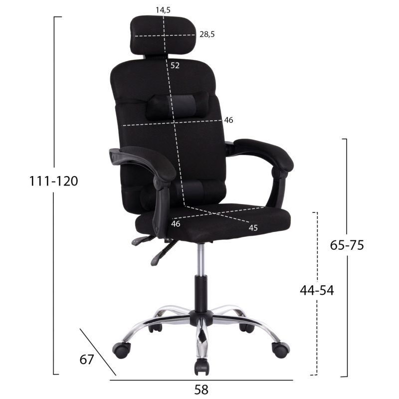 Офис стол с мрежест плат в черно. Размери: 61x56x118H см.