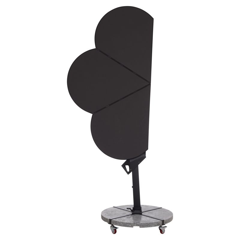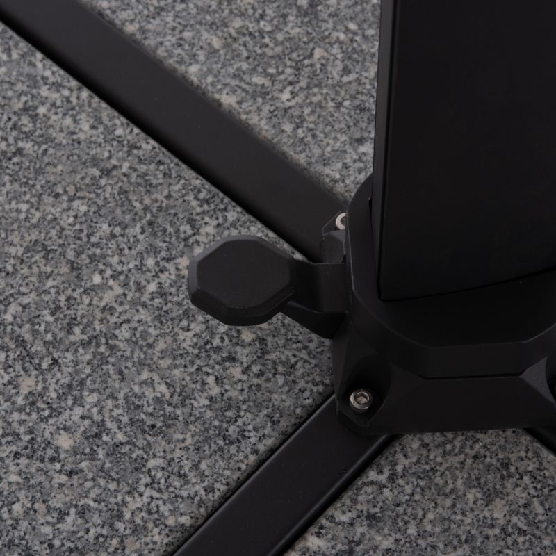 Основата от 120 кг, изработена от естествен гранит, разделена на четири секции в рамките на рамка с кръстовидна форма, предлага абсолютна стабилност, докато поцинкованите стоманени колела позволяват чадърът лесно да се мести навсякъде, където пожелаете. Всички части са боядисани в елегантен тортора цвят, създавайки модерна и дискретна естетика.