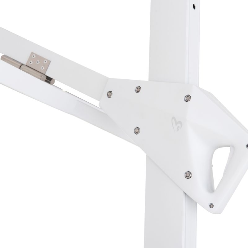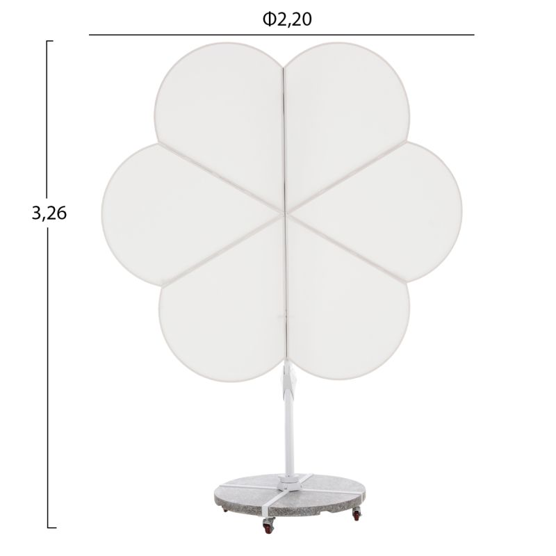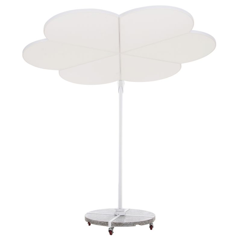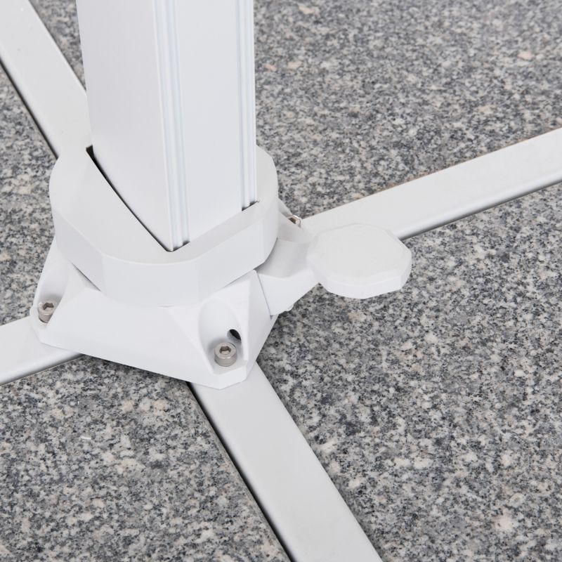 Основата от 120 кг, изработена от естествен гранит, разделена на четири секции в рамките на рамка с кръстовидна форма, предлага абсолютна стабилност, докато поцинкованите стоманени колела позволяват чадърът лесно да се мести навсякъде, където пожелаете. Всички части са боядисани в ярък бял цвят, създавайки модерна и дискретна естетика.