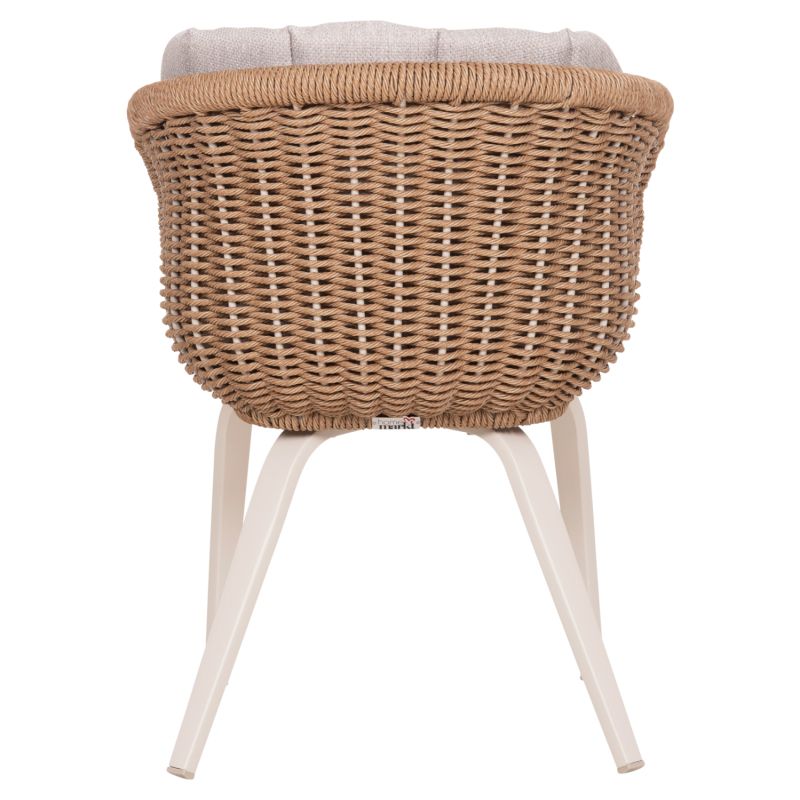 Меките светлобежови възглавници на седалката и облегалката повишават комфорта, създавайки приветливо усещане за ежедневна употреба в градинска или терасна трапезария.