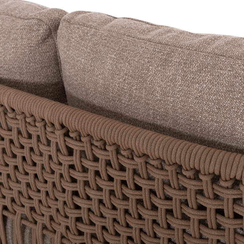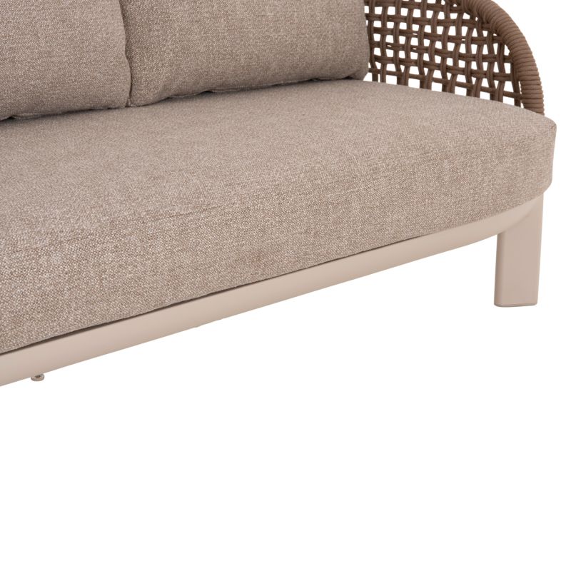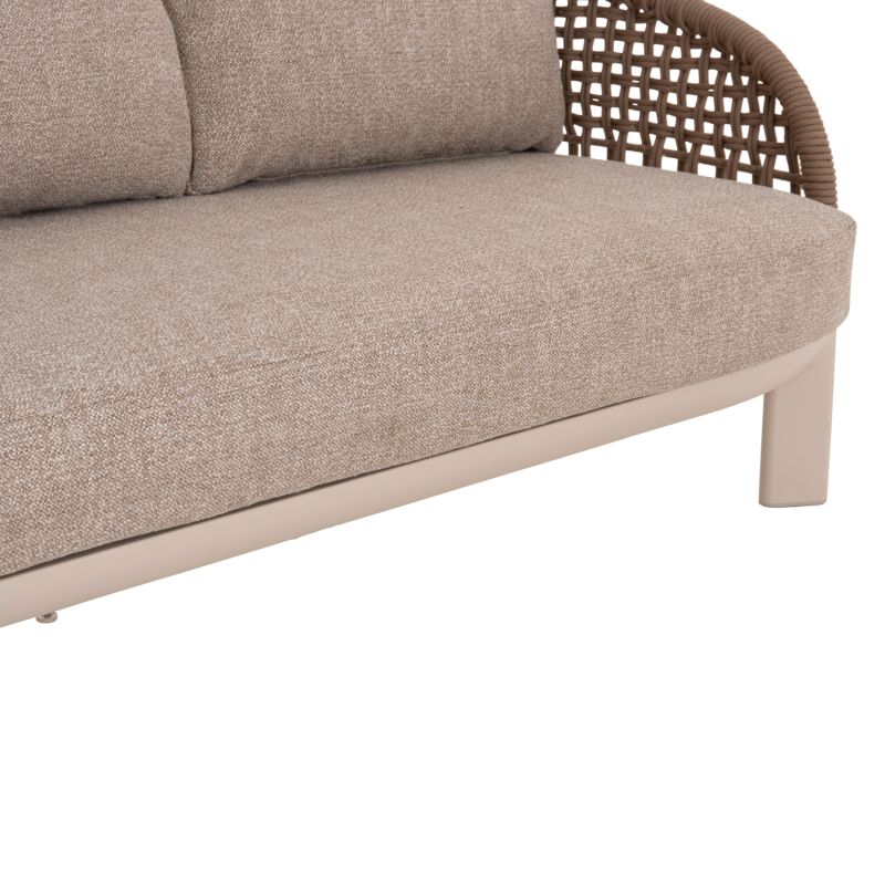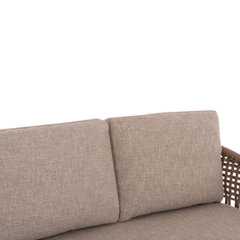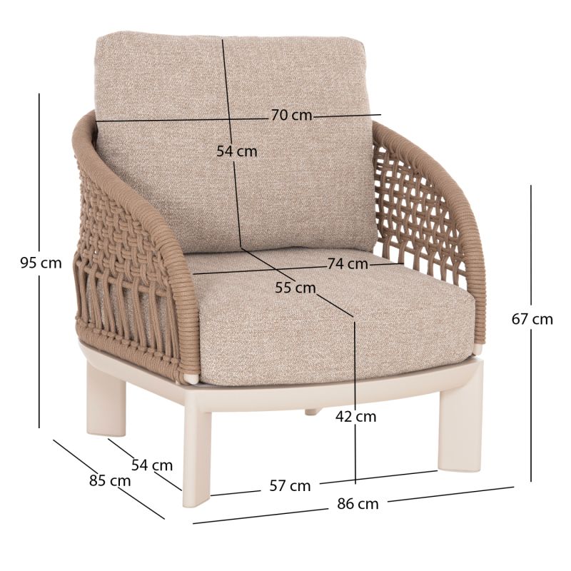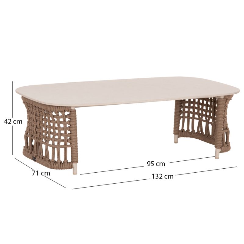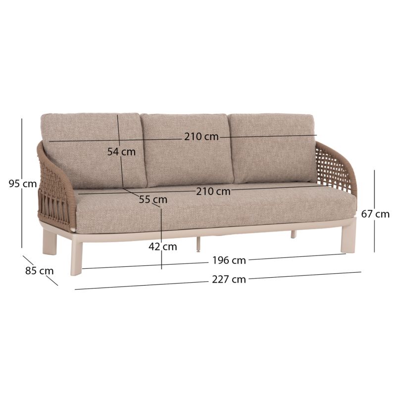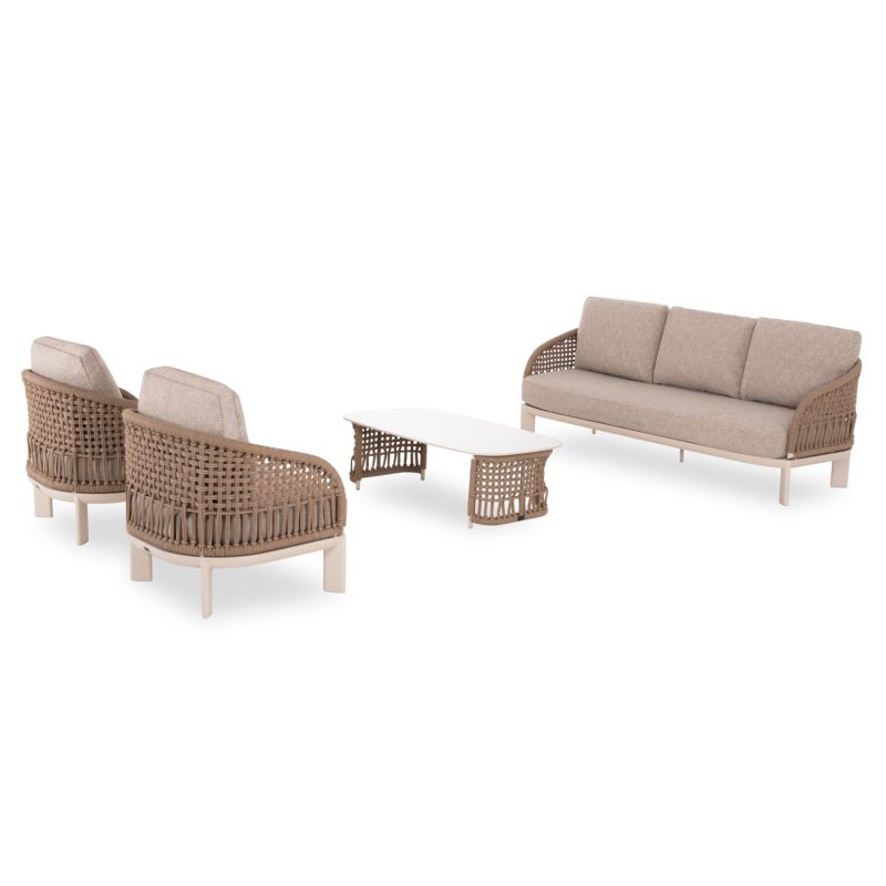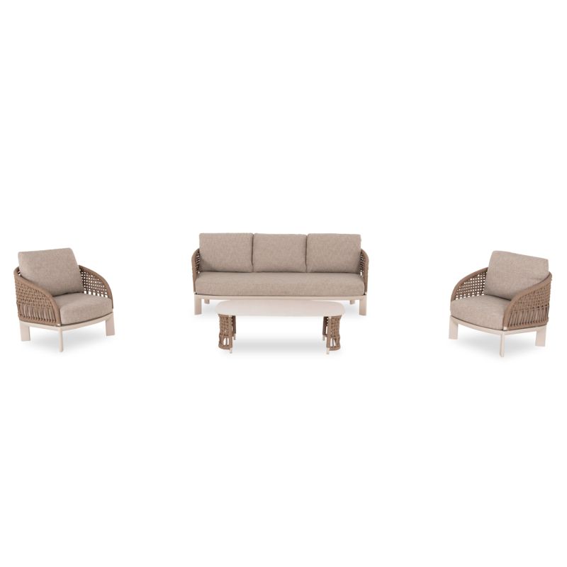 Състои се от 2 фотьойла с удобни възглавници за седалката и облегалката, триместен диван със същата естетика, разбира се, и масичка за кафе с плот от синтерован камък. Цветът на рамката е слонова кост, въжето е в естествен цвят, а калъфките за възглавници са БЕЖОВИ.