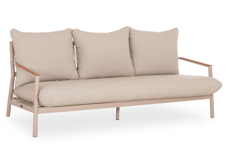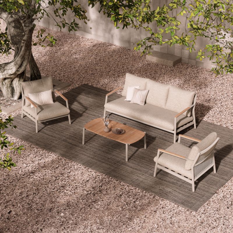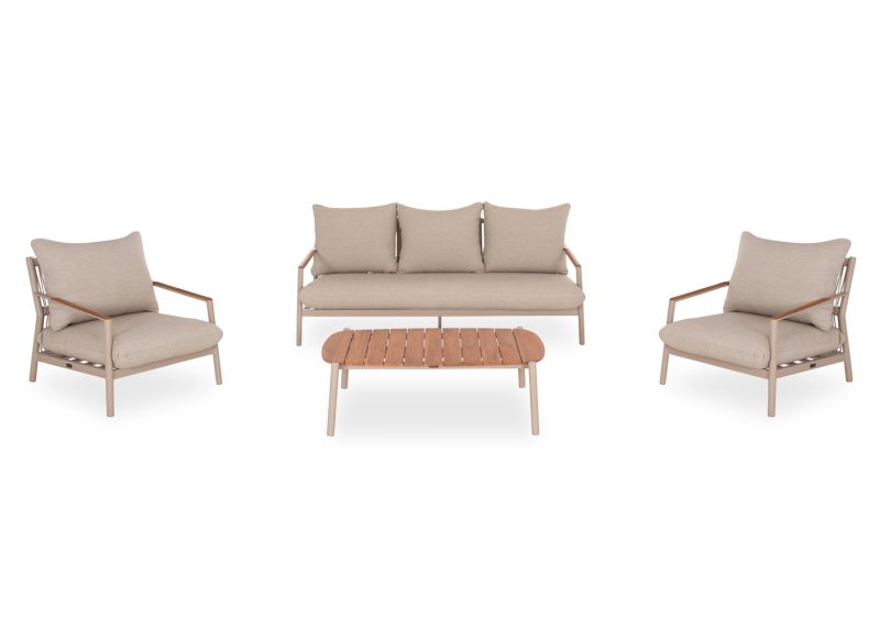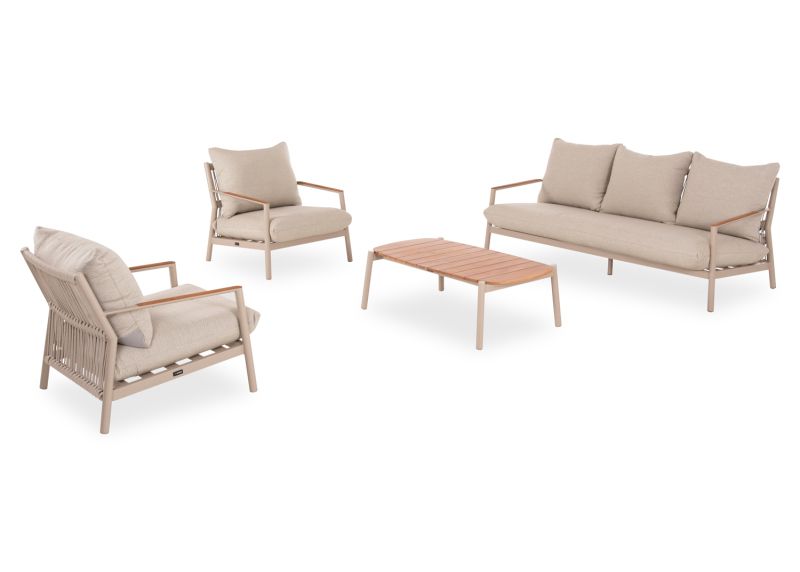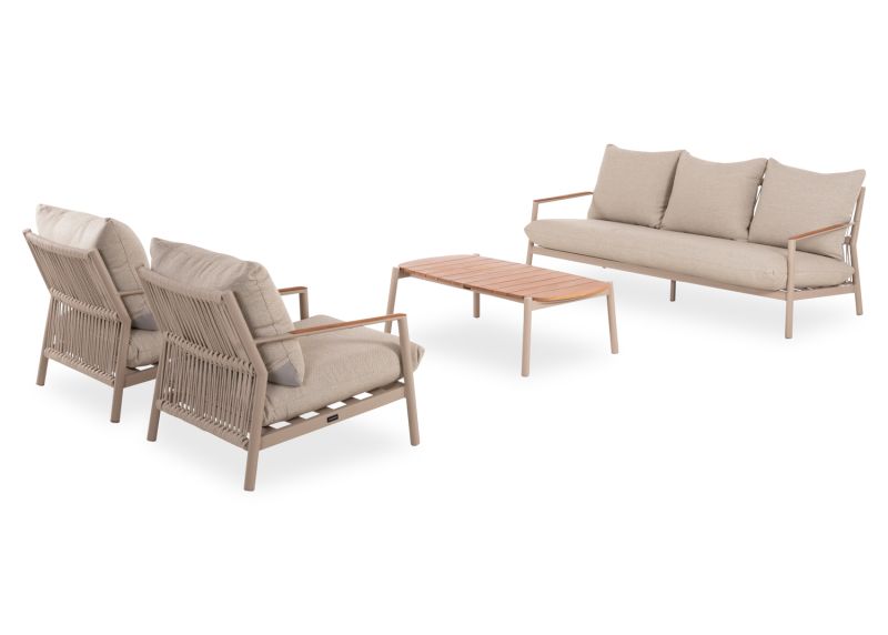 Състои се от 3-местен диван, два прекрасни фотьойла и правоъгълна масичка за кафе! Рамката им е изработена от алуминий в БЕЖОВ цвят с въже на облегалката в подобен цвят, а възглавниците също са в БЕЖОВ цвят. Тиковото дърво на плота, но и като калъф на подлакътниците на дивана и фотьойлите, засилва усещането за лукс!